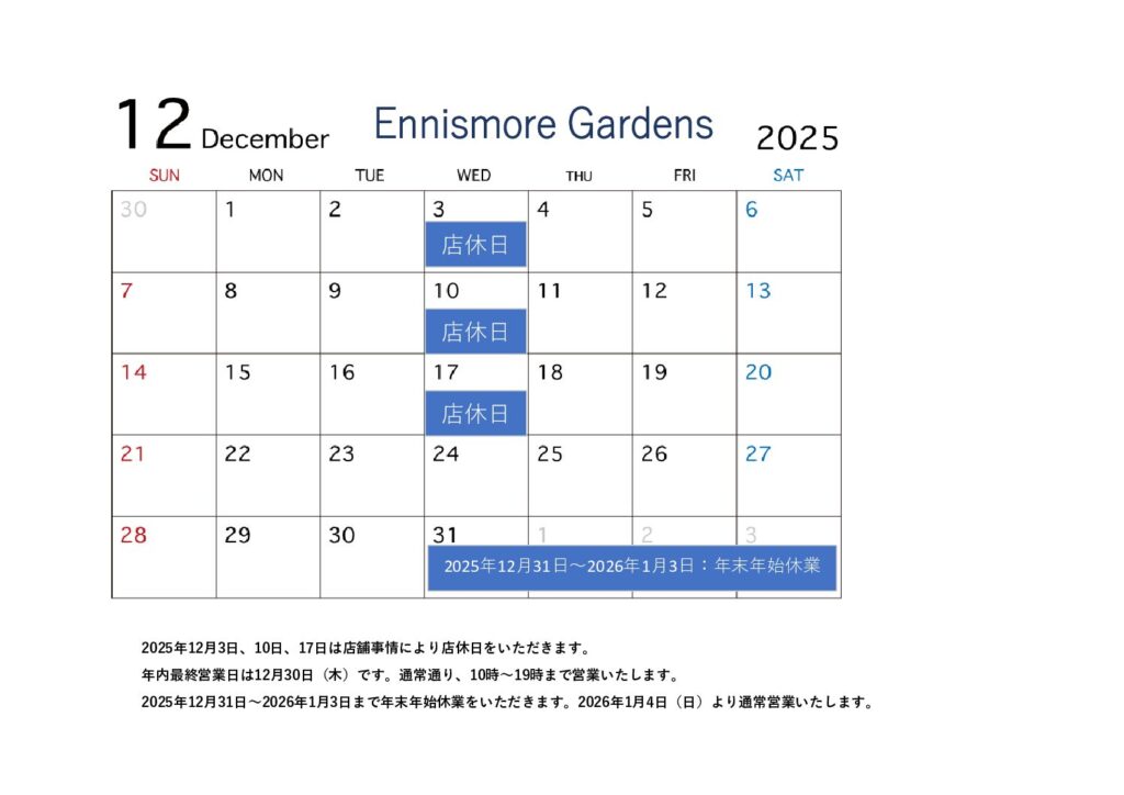 エニスモアガーデン代官山店の12月の営業日につきまして