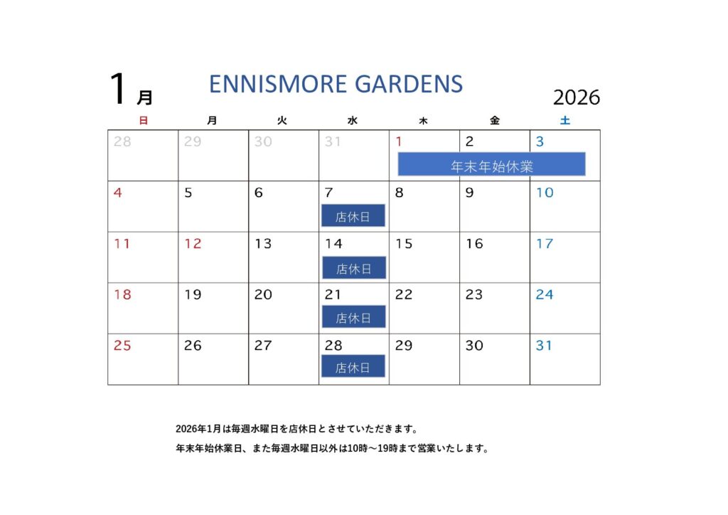 エニスモアガーデン代官山は1月は毎週水曜日を店休日とさせていただきます。